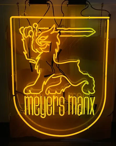 Meyers Manx’ Custom Neon Signage in Classic Gold Neon Mounted on a Clear Acrylic Backer with Lips on Top and Bottom – Fabricated by Designer Neon Signs. Call 310-608-6099